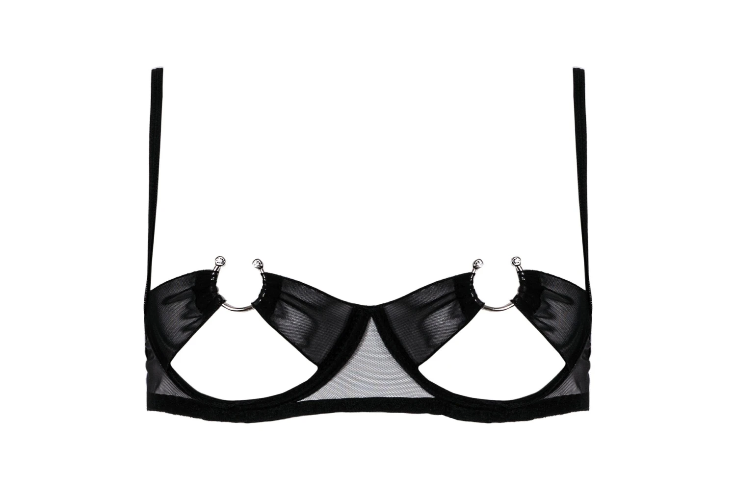 Cet ensemble deux pièces alléchant est conçu pour mettre votre corps en valeur. Le soutien-gorge ouvert sexy comporte des armatures pour un ajustement flatteur, avec un voile transparent au cœur de la poitrine tandis que le reste est composé de bandes invitantes qui épousent vos courbes à tous les bons endroits.