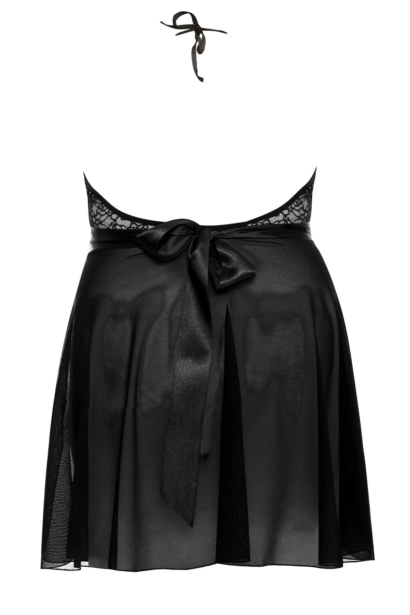 Alliance entre dentelle fine sur le poitrine et voilage sur le bas du corps. Une ceinture satinée vient resserrer la nuisette sous la poitrine, elle se terminera dans le dos par un gros noeud de satin noir. On retrouvera d’ailleurs dans le bas du dos la dentelle qui recouvre la poitrine. Le haut du dos est laissé nu, on découvrira juste sur la nuque le lien qui sert à ajuster et à maintenir votre nuisette sexy sur le buste.